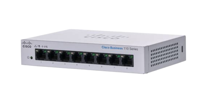 The Cisco Business 110 Series Unmanaged Switches are affordable, plug-and-play entry-level switches that provide gigabit Ethernet switching with key features like energy efficiency and traffic prioritisation for a fast and resilient small business network.